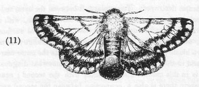 Alis posticis, basi ochraceis, fascia, apiceque late brunneo-nigris, margine postico subaurantiaco. Illustration 28 Insects 11.