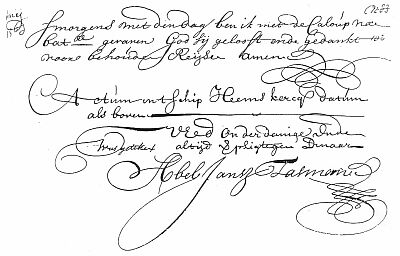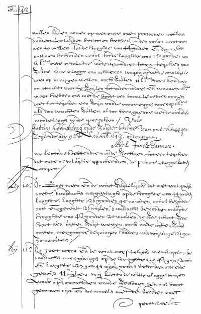 Thus done and passed at the dwelling-house of the declarant, outside this town on the tenth of the month and year aforesaid, about five o'clock in the afternoon, in the presence of Jacob Jacobsz van Dantsick, burgess of this town, living in the neighbourhood of the declarant, and Lambert van Dam, Notary's clerk, summoned to witness this as credible witnesses, who have signed their names to the present together with the declarant and me Notary (signed) A. J. Tasman (lower down was written quod attestor Jan Keyser, Notary (in margine was written) X (to which as added in writing) written by Jacob Jacobsz van Dansick and Lambert van Dam.