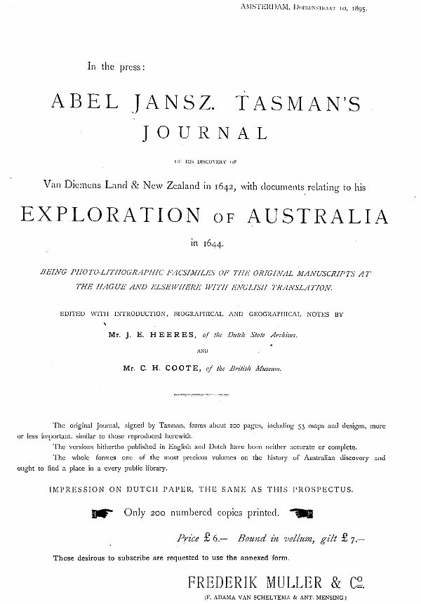 For some years past numerous applications, in the first place from Australia, have been made to us for documents and works relating to Tasman and his discoveries. In the course of the investigations required on our part in order to comply with the wishes of such applicants, we soon became convinced that all existing works on the subject are either unreliable or sadly incomplete.