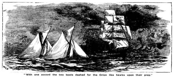 Throughout the night the Ena's and the Sir Henry's lights were in sight of each other as the boats flew homewards before a strong southerly breeze, each with a reef in her mainsail. As the morning broke bright and clear the Heads of Endeavor loomed blue in the distance, and jogging along towards them was a noble ship just beginning to shorten sail. One glance was enough to recognise the Orion, which had doubtless passed them in the night, keeping further to the eastward. Shaking their reefs out with one accord, the two boats dashed for the Orion like hawks upon their prey over the two-mile stretch that separated them from her. Now was the time for each to show what she could do at a pinch. Leaning over to the breeze, they tore through the water for some time almost "neck and neck." Then, as they approached the Orion, it could be seen that the Ena was surely outsailing her rival, gradually drawing ahead, until Benty, sitting well aft, was able to wave his hand in ironical adieu to Pant, steering his own boat. Then, all at once the Ena gained a little, bringing her nose on the Sir Henry's port quarter. "It's no use, old man," sang out Benty, "pity you didn't take my offer last night. Too late now. We'll have her line in another ten minutes. So long."